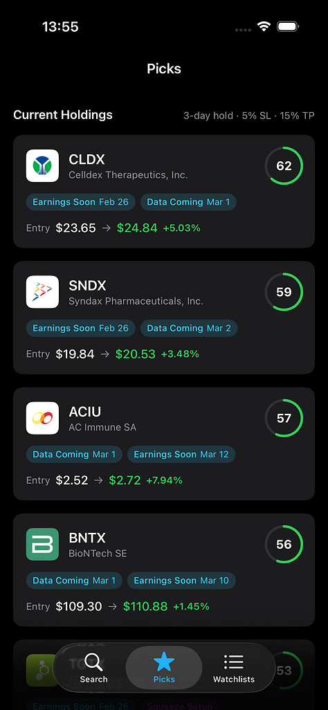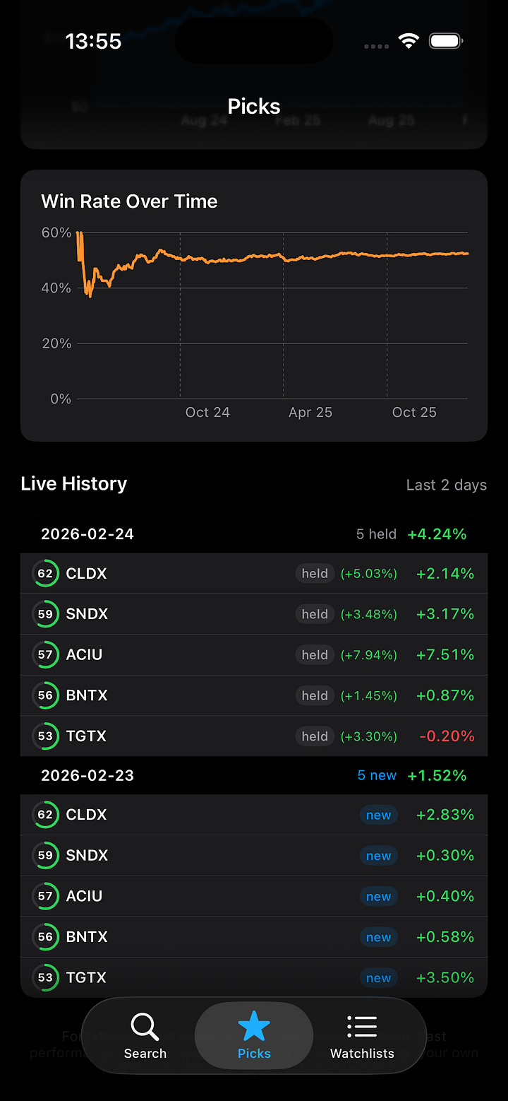 Biostock now includes Signal Picks - a scoring system that selects 5 biotech stocks, holds them for 3 trading days, and tracks every result live. Fully automated, rules-based, full transparency.