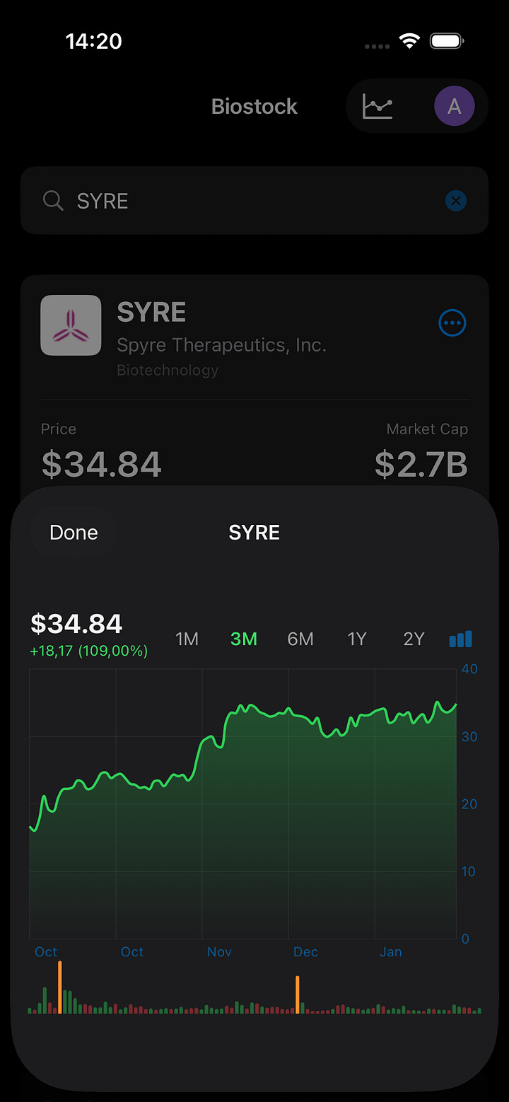 Quick-glance charts - Open up a price chart without leaving the screener. Scrub through daily prices, toggle line/candlestick, and spot unusual volume spikes at a glance. Web version also comes with support / resistance levels closest to the current price level.
